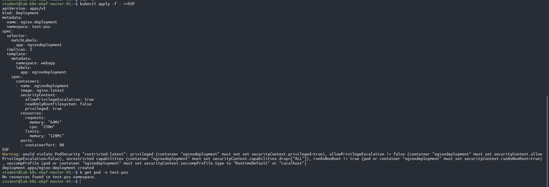 lalu coba deploy pod yang disini terlihat menggunakan securityContext[*] yang dalam implementasi kita dilarang, jadinya seperti berikut