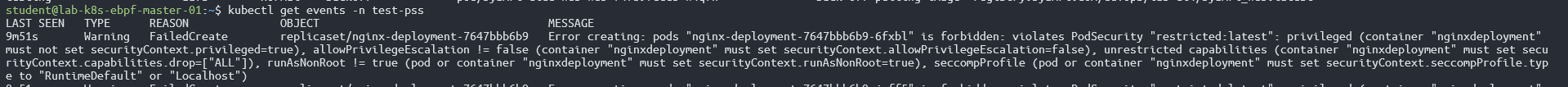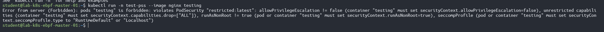 Selanjutnya mencoba membuat pod dengan command kubectl run -n test-pss --image nginx, disini dilarang oleh pss karena pod yang baru dibuat, berjalan menggunakan user root. Hasilnya pod tidak akan dischedule