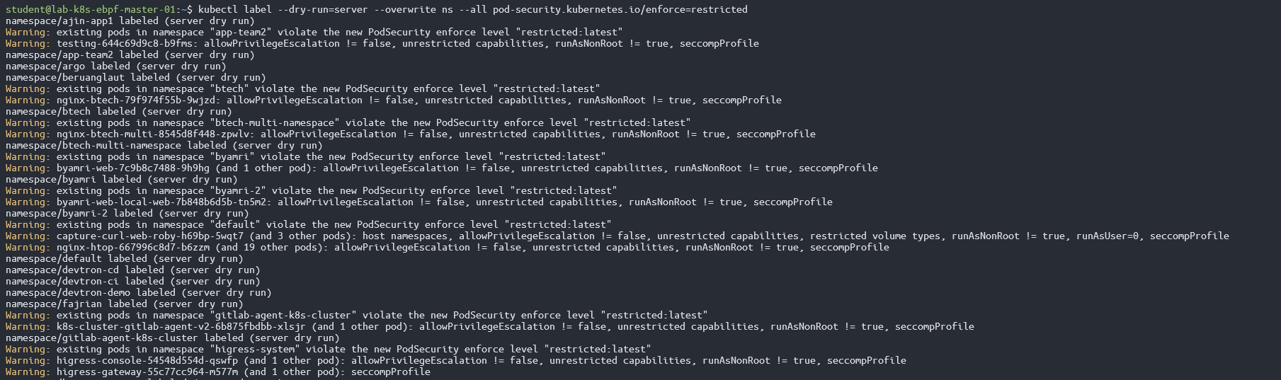kubectl label --dry-run=server --overwrite ns --all pod-security.kubernetes.io/enforce=restricted